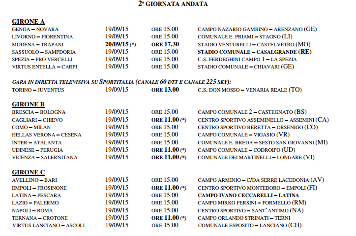 Il programma della 2^ giornata del Campionato Primavera Tim